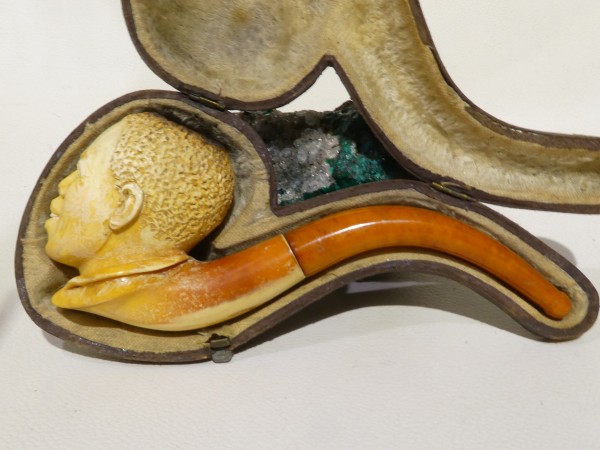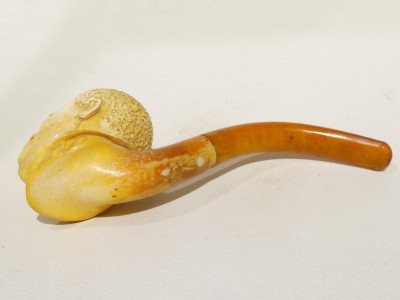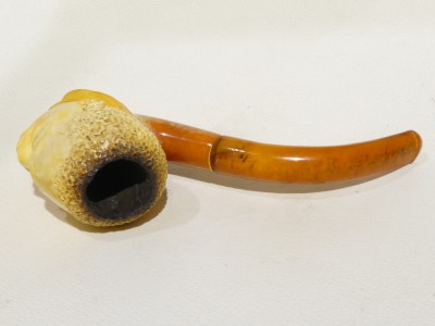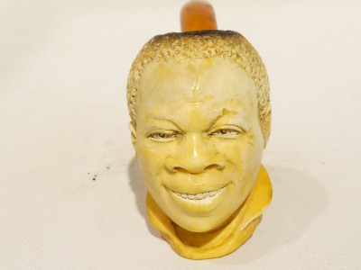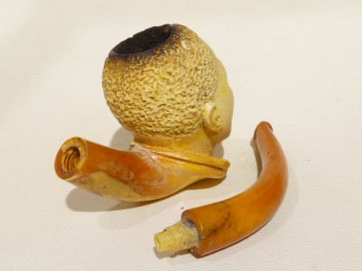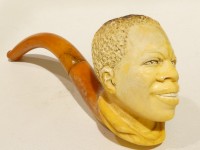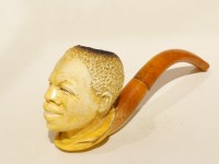 Ancient and rare meerschaum pipe, probably produced in Vienna between the end of the 19th century and the beginning of the 20th century. The pipe represents the head of a Moor; the mouthpiece is in amber grafted with an ivory screw on the stem. The pipe is in a very good state of preservation. The amber mouthpiece has been repaired.