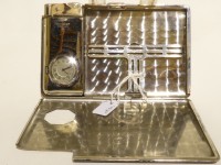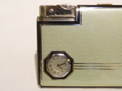 Seigneur cigarette case BRIT. PAT.N° 479739 M.i. GERMANY, with clock (working) and petrol lighter; the finish is light green and black guilloche enamel. 1930s.