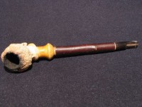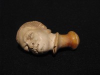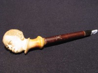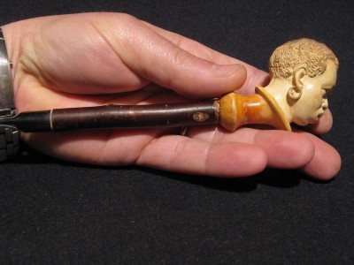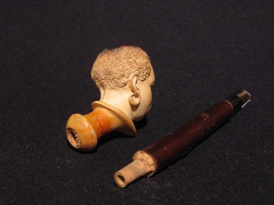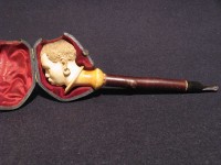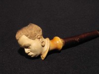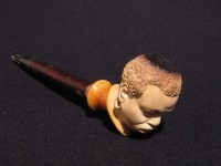 Antica pipa in schiuma, raffigurante testa di moro. Bocchino in corno con cannello in marasca. La pipa e finemente eseguita e probabilmente di origine viennese della seconda meta dell' 800. La pipa e fornita del suo astuccio marcato "PIETRO VIZIO VIA ROMA 34 - TORINO".Â