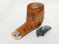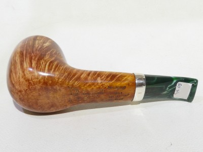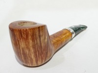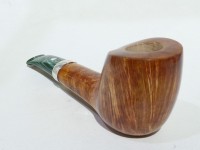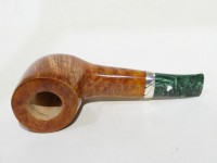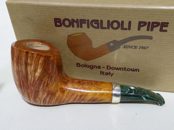 Pipa Bonfiglioli serie FOR COLLECTORS 2026 Fiammata modello 1/4 bent Dublin Free Hand dalla finitura liscia e colore bruno. Bocchino in metacrilato simil malachite non sellato; il cannello è adornato da ghiera in argento.