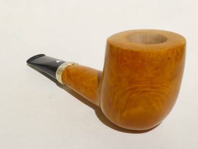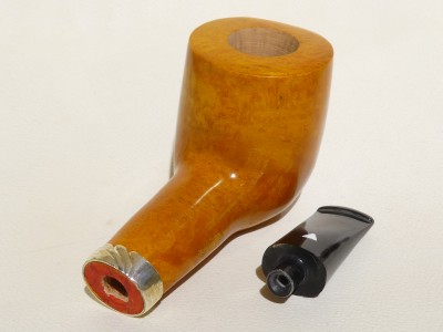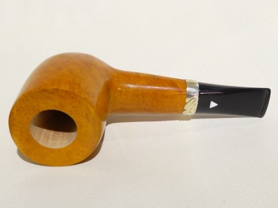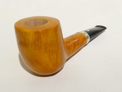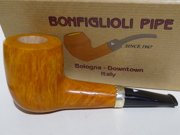 Pipa Bonfiglioli serie FOR COLLECTORS 2026 modello chubby Billiard dalla finitura liscia e colore arancione chiaro. Bocchino in metacrilato nero non sellato; il cannello è adornato da ghiera in argento lavorata.