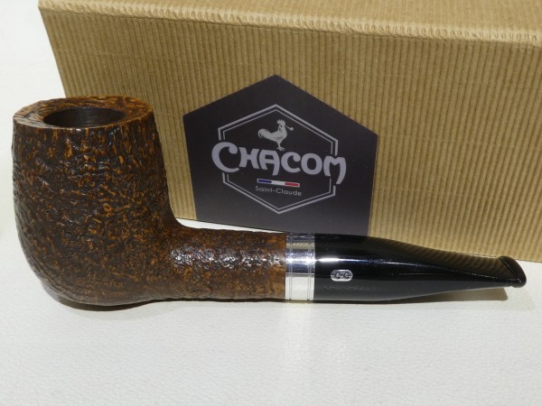 Pipa Chacom modello 1201 MAIGRET dalla finitura sabbiata colore marrone. Bocchino in metacrilato nero non sellato; il cannello è adornato da ghiera in metallo bianco.