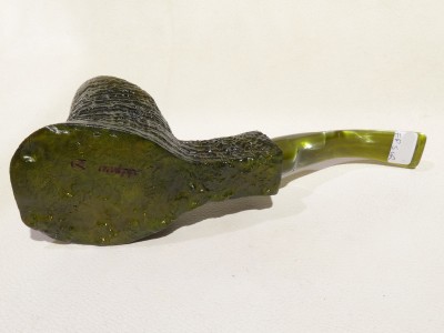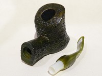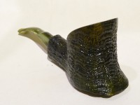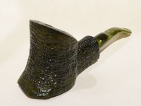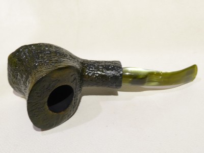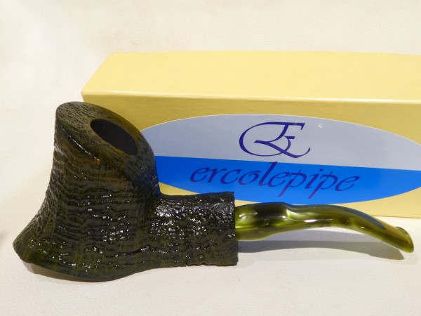 Pipa Ercole pipe by Raffaele Bogni, modello big half bent Free Hand con bark top nella parte inferiore, finitura sabbiata e colore verde scuro. Bocchino in metacrilato variegato verde sellato con filtro 9 mm.