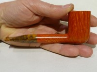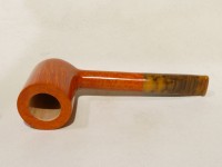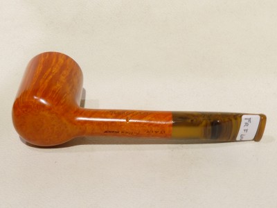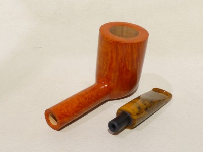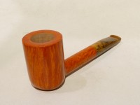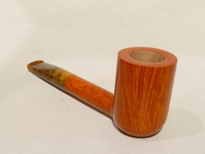 Pipa Fabrizio Romeo serie F modello short Liverpool, dalla finitura liscia fiammata e colore arancione chiaro. Bocchino in metacrilato variegato simil corno non sellato.
