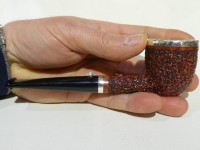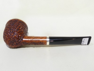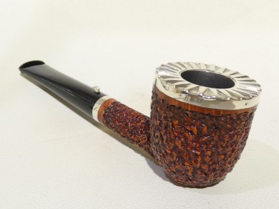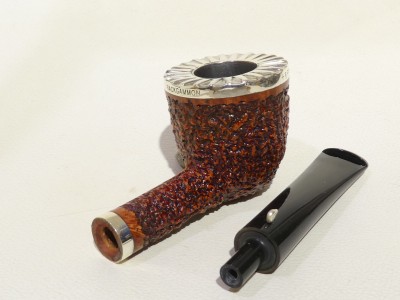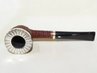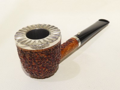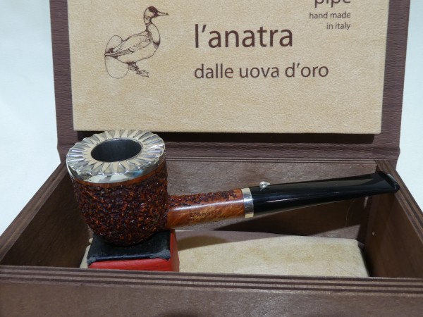 Pipa L'Anatra dalle Uova d'Oro serie BACKGAMMON modello Dublin stand up dalla finitura rusticata e colore marrone. Bocchino in metacrilato nero non sellato. Il top del fornello è adornato con ghiera in argento TRIC TRAC.