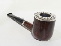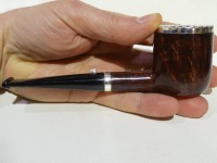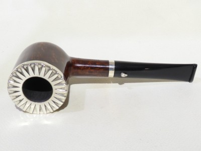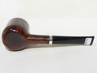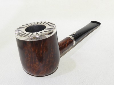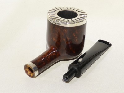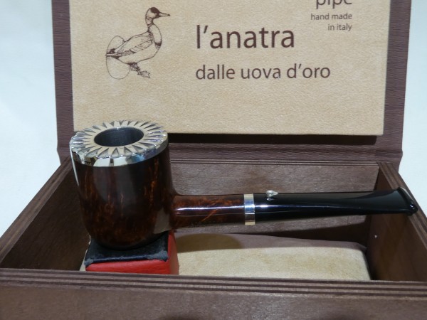 Pipa L'Anatra dalle Uova d'Oro serie BACKGAMMON modello Billiard stand up dalla finitura liscia e colore marrone rossiccio. Bocchino in metacrilato nero non sellato. Il top del fornello è adornato con ghiera in argento TRIC TRAC.