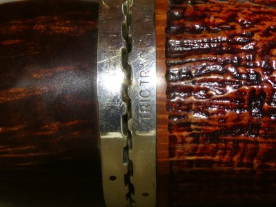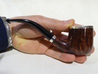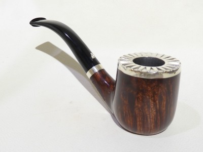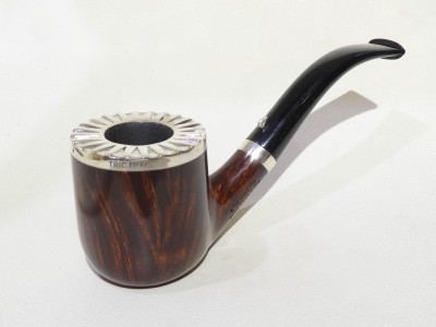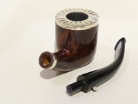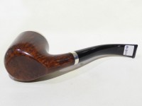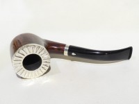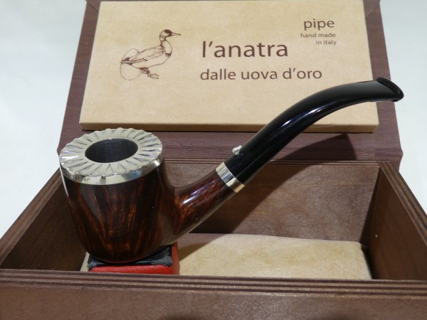 Pipa L'Anatra dalle Uova d'Oro serie BACKGAMMON modello bent Billiard stand up dalla finitura liscia e colore marrone rossiccio. Bocchino in metacrilato nero non sellato. Il top del fornello è adornato con ghiera in argento TRIC TRAC.