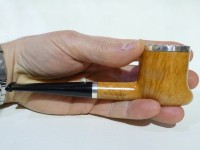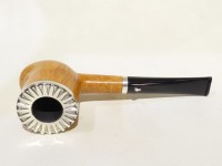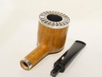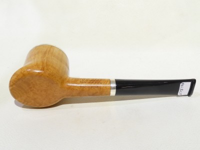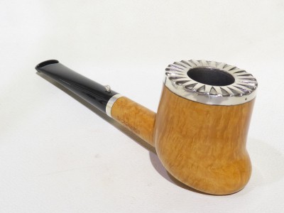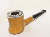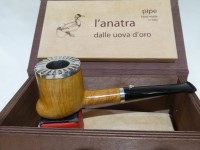 Pipa L'Anatra dalle Uova d'Oro serie BACKGAMMON modello stand up dalla finitura liscia e colore naturale. Bocchino in metacrilato nero non sellato. Il top del fornello è adornato con ghiera in argento TRIC TRAC.