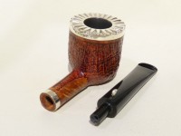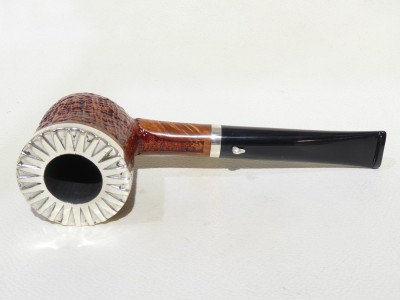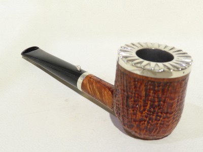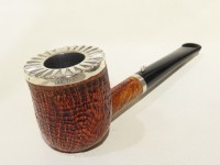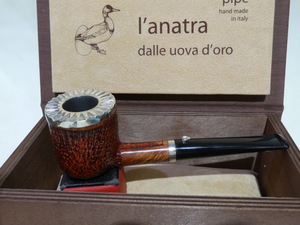 Pipa L'Anatra dalle Uova d'Oro serie BACKGAMMON modello Billiard stand up dalla finitura sabbiata e colore marrone. Bocchino in metacrilato nero non sellato. Il top del fornello è adornato con ghiera in argento TRIC TRAC.