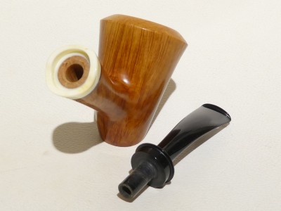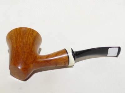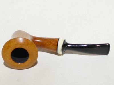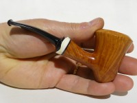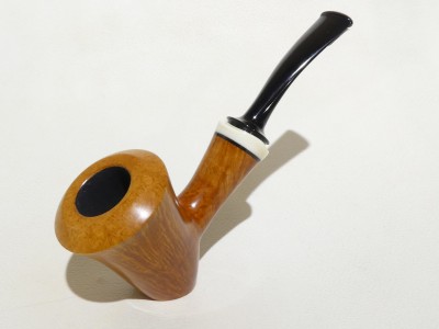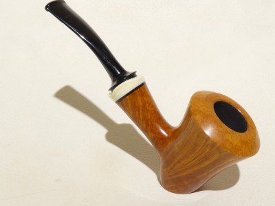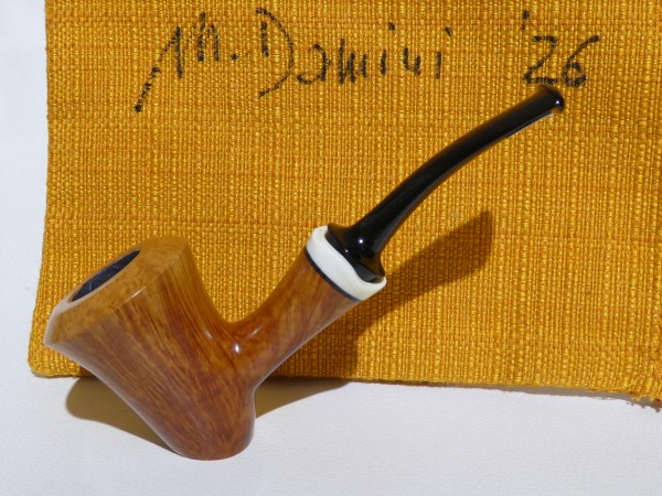 Pipa Massimo Damini modello Stand Up Dublin dalla finitura liscia e colore arancione chiaro ambrato. Bocchino in metacrilato nero fancy; il cannello è adornato da ghiera in osso di facocero.