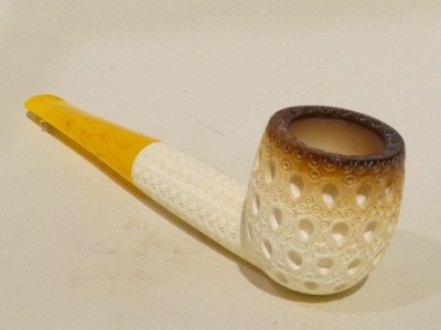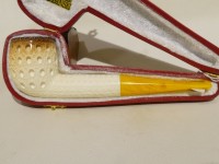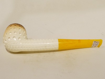 Pipa in schiuma turca modello Billiard, finitura traforata; bocchino in lucite gialla non sellato. La pipa e fornita di astuccio rigido color burgundy.Â