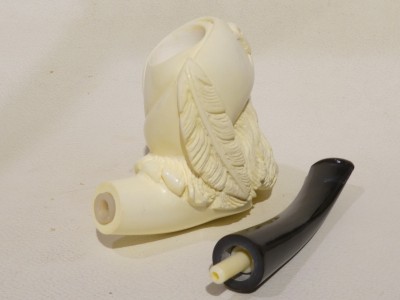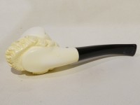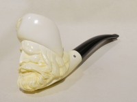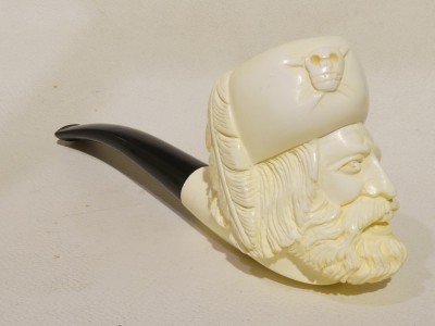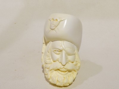 Pipa in schiuma turca raffigurante una testa di pirata. Bocchino in bakelite nera non sellato. La pipa e fornita di scatola e sacchetto Lanzola.