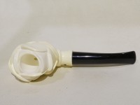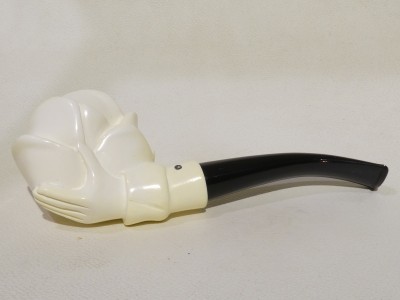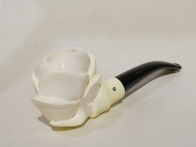 Pipa in schiuma turca raffigurante una mano che sorregge una grande rosa. Bocchino in bakelite nera non sellato. La pipa e fornita di scatola e sacchetto Lanzola.