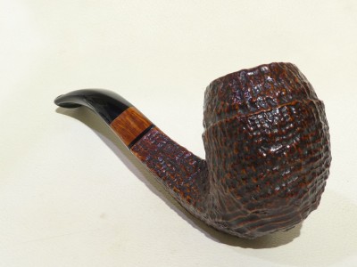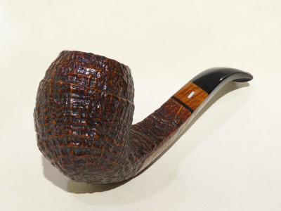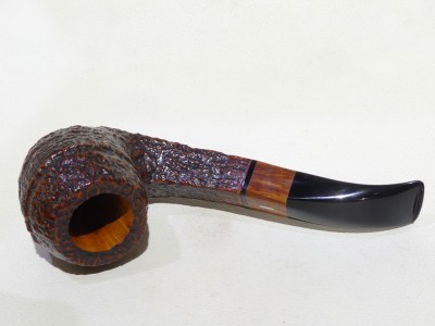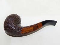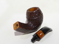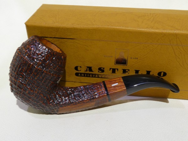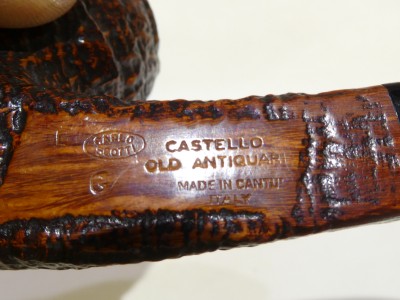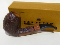 Pipa Castello serie Old Antiquari G modello bent Bulldog con cannello quadro dalla finitura sabbiata e colore marrone. Bocchino in metacrilato nero non sellato in inserto in radica. La pipa è marcata Carlo Scotti.