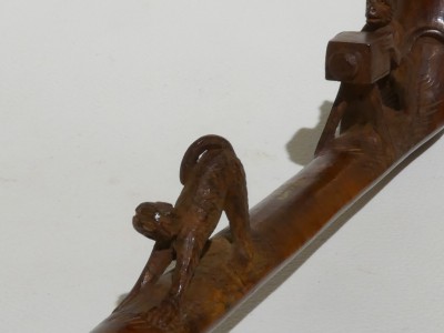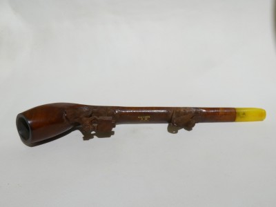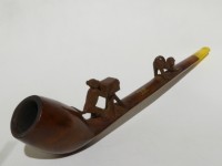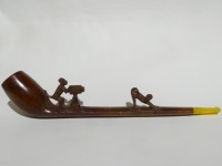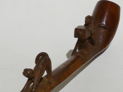 Antica pipa francese marcata 35. B. S. MARTIN B.M. PARIS, in radica con rappresentazione di una scimmia che si appresta a fotografare il sedere di un'altra scimmia. Bocchino in ambra con perno in osso. La pipa è dotata di astuccio originale e risale alla fine dell'800, primi '900.