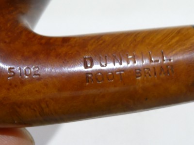 Pipa Dunhill serie ROOT BRIAR modello 5102 bent Billiard dalla finitura liscia e colore naturale ambrato. Bocchino in ebanite nera non sellato.