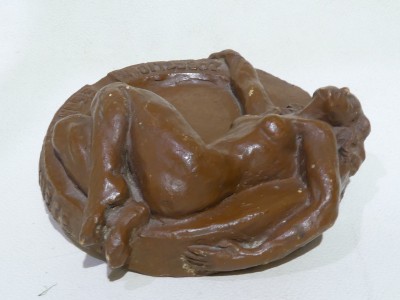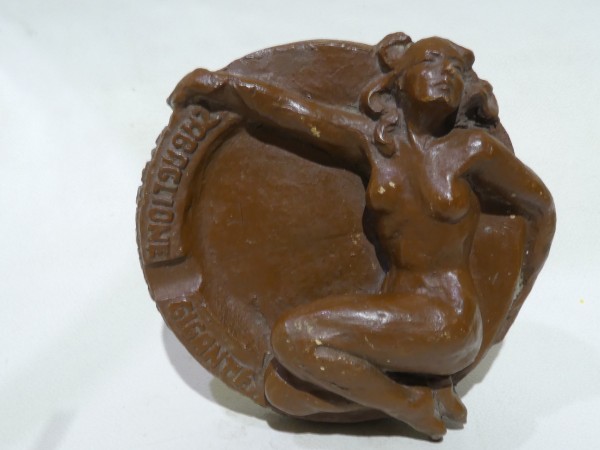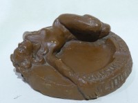 Posacenere in terracotta del periodo Liberty "LIQUORIFICIO BOLOGNESE - ZABAGLIONE GIGANTE". Vi è rappresentata una figura femminile nuda, sdraiata ad abbracciare lo stesso posacenere. L'esecuzione della figura femminile è stata eseguita magistralmente da un ottimo scultore, riuscendo a dare la percezione della plasticità del corpo e della sensualità .