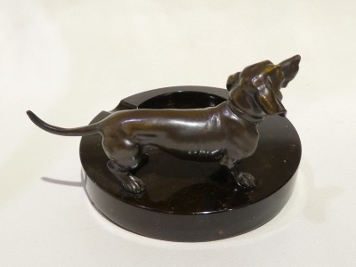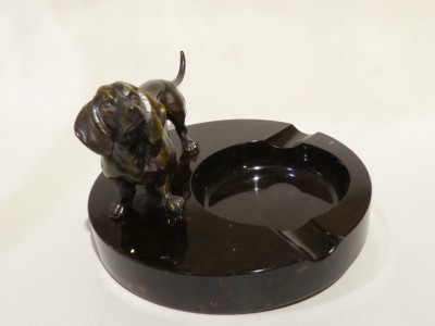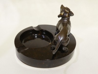 Posacenere Liberty in pietra labradoritica marrone con bassotto in bronzo.