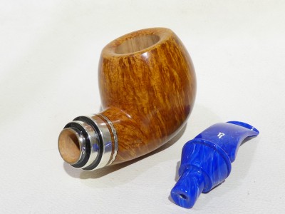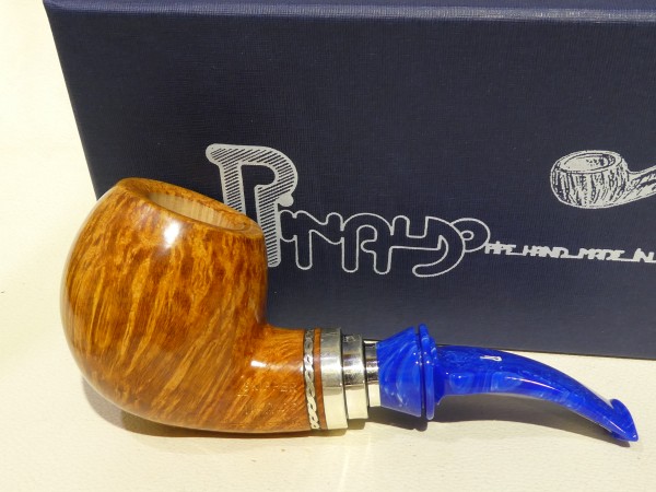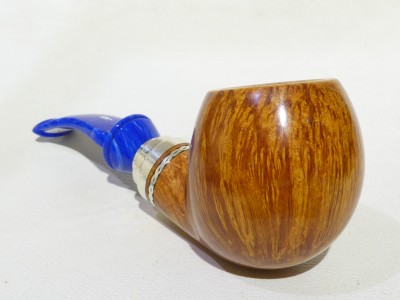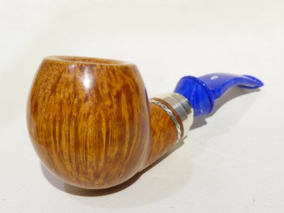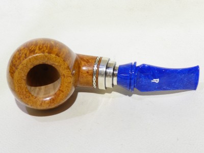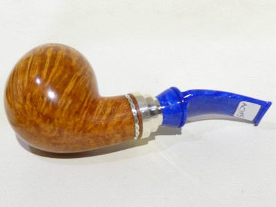 Pipa Rinaldo serie SKIPPER COLLECTION FIAMMATA ACRON YY  silver line 5 modello half bent Apple; finitura liscia di colore ambrato scuro. Bocchino in metacrilato variegato blu fancy. Il cannello e adornato da ghiera in argento lavorata nel tipico disegno "skipper".